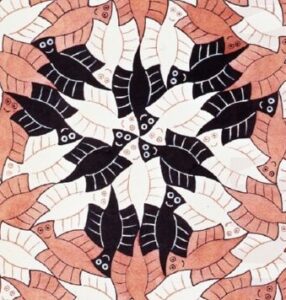 Dit schilderij hieronder is opgebouwd uit dezelfde vis, maar deze is vaak gedraaid en gespiegeld. Bekijk de witte vis die rechtop in het midden staat.