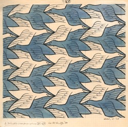 Vaak maakt Escher zijn prenten interessanter door sommige van zijn figuren naar rechts en andere naar links te laten kijken. De vogel in het linkerplaatje is hier een voorbeeld van. Onder elke vogel komt een nieuwe vogel, maar dan een gespiegelde versie ervan!